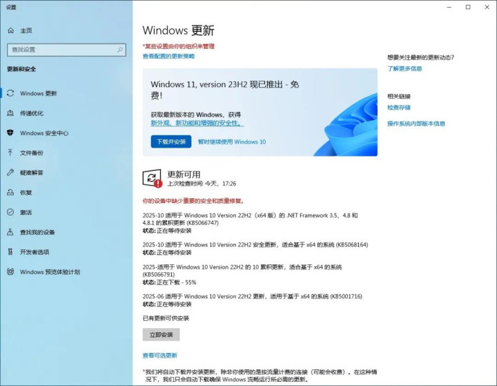 老田自己的电脑,配置比较高,硬件都满足Win11的要求。2025年10月25日电脑右下角跳出了更新提示,打开之后就直接出现了升级Win11的选项,点了一下“下载并安装”之后,就自己升级好了。