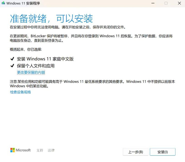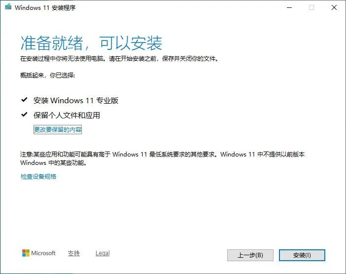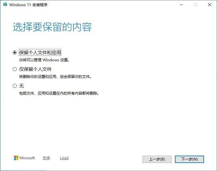 这里默认的系统覆盖模式,就是保留个人文件和应用,可以不用操作,直接选择安装。如果不是这个,可以点击“更改要保留的内容”进行选择,界面如下: