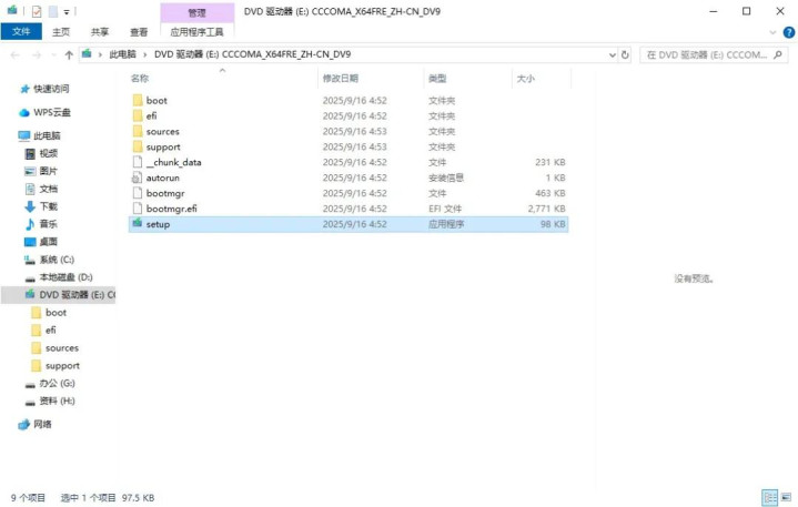 装载后会自动弹出“DVD驱动器ESD-ISO”界面,点选运行“setup”运行安装程序,进入安装界面: