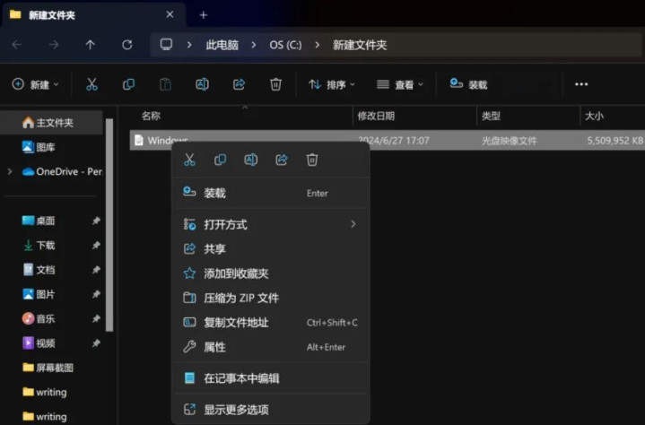 打开保存的文件夹,右键点选ISO文件并选择“装载”: